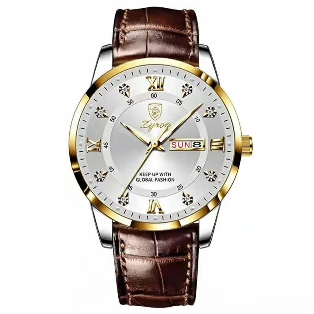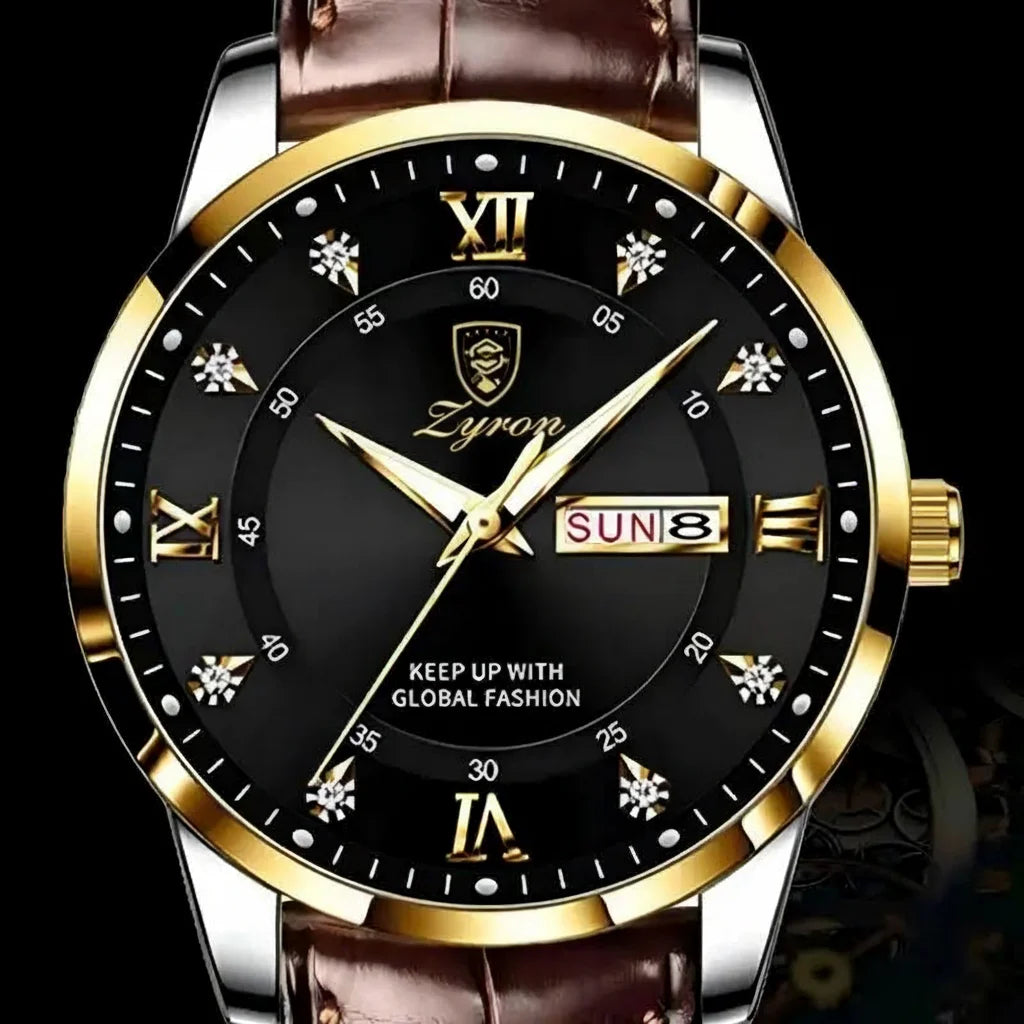 The Zyron watch combines timeless design with modern functionality, featuring luminous hands and a convenient day-date display. It's more than a watch; it's a statement of sophistication and utility.