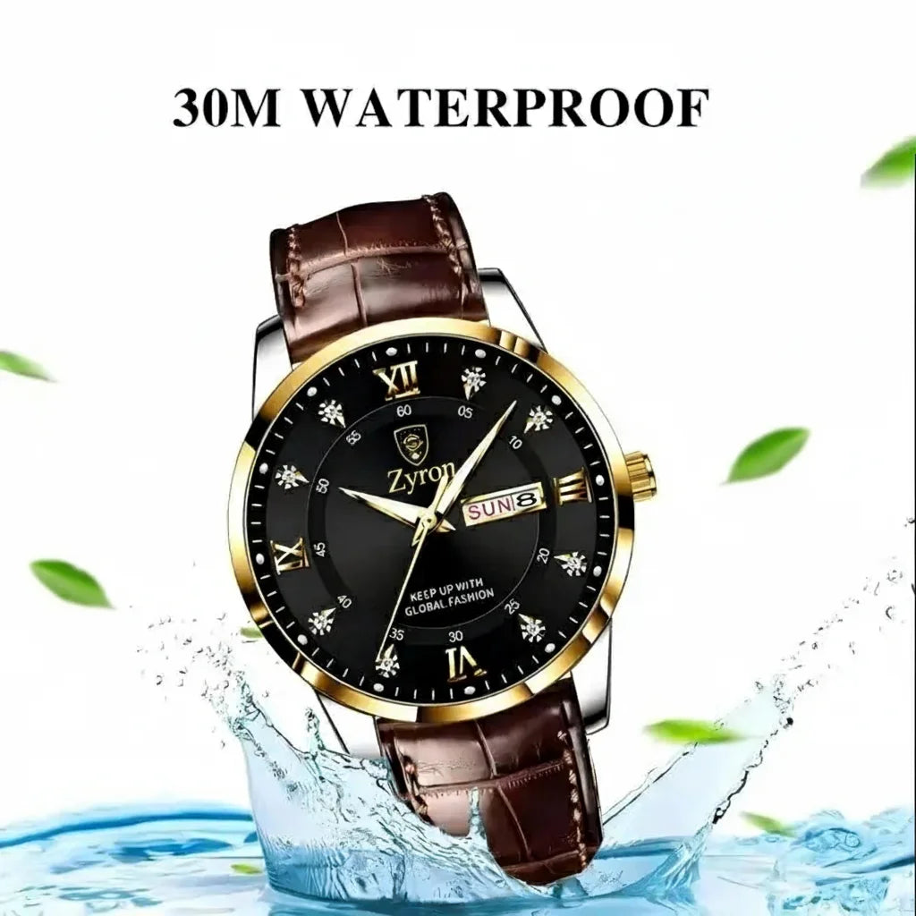 Whether it's a sudden shower or daily wear, your Zyron watch is built to last. Enjoy precision timekeeping and the comfort of a premium leather strap, ready for anything.